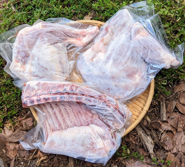 子どものイノシシを6つに分割した骨付き肉、モモ(後ろ足)&ウデ(前足)の脚2本分と、ブロックのままのスペアリブ、たっぷり半身分3パックを、真空パック・冷凍してお届けします。