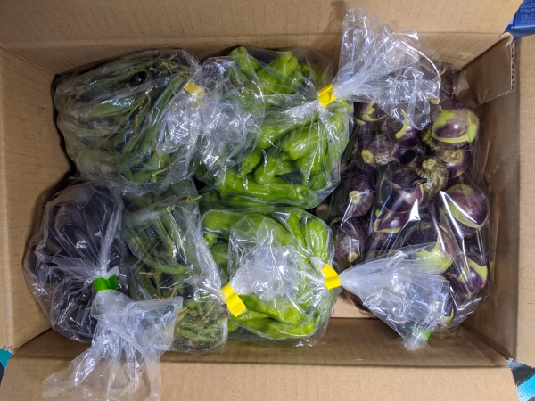 薄皮丸ナス1袋、シシトウ2袋、インゲン2袋、長ナス1袋の詰め合わせです。