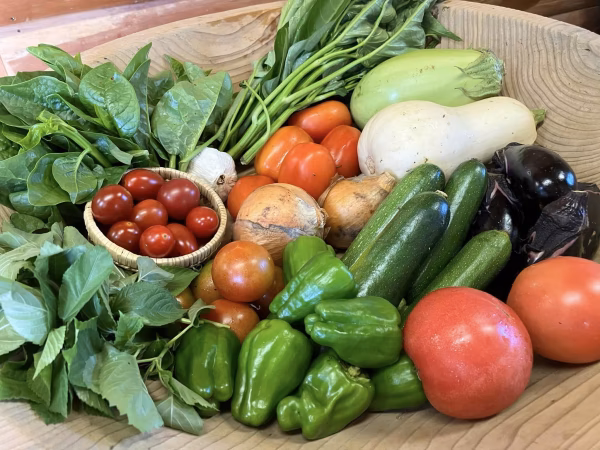 大玉トマト2個 ミニトマト10個 中玉トマト5個 イタリアントマト5個 ミニズッキーニ3本 茄子5個 ピーマン6個 長ネギ2本 ミニカボチャorバターナッツ オクラ 空芯菜 ツルムラサキ モロヘイヤ +α