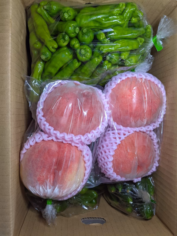 桃1.3kg、薄皮丸ナス500g✕4袋、キュウリ600g、ピーマン600g、シシトウ550gの詰め合わせです。