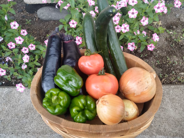 なす、トマト、きゅうり、いんげん、オクラ、ピーマン、玉ねぎ、にんにく、ジャガイモ、人参などなど。