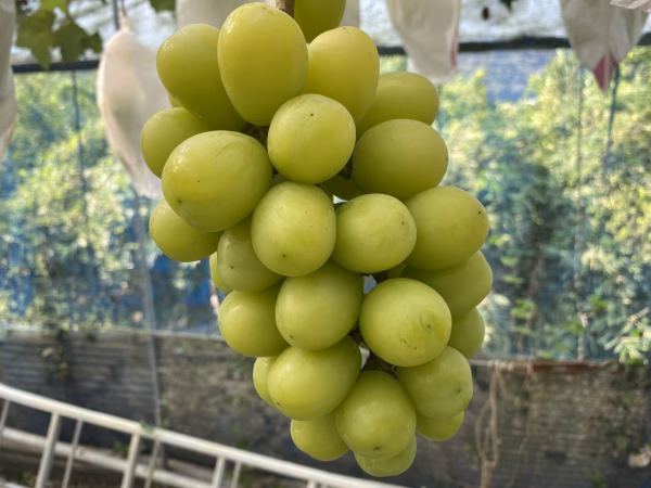 ▼雨除けのビニールハウスで栽培をしています。ジベレリンなどで種なしの処理を行っていますが、たまに種が残っている場合もございます。