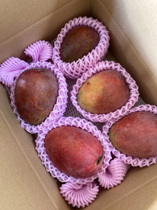 完熟ならではのとろける食感、溢れる果汁、芳醇な香り。食べ頃のマンゴーを白無地に2kg以上入れてお届けします。