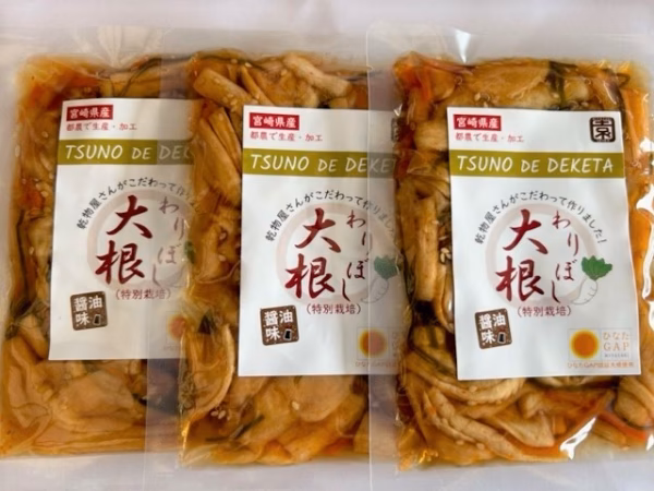昔ながらの天日干しで作ったわりぼし大根を地元都農町でお漬物に加工しました。