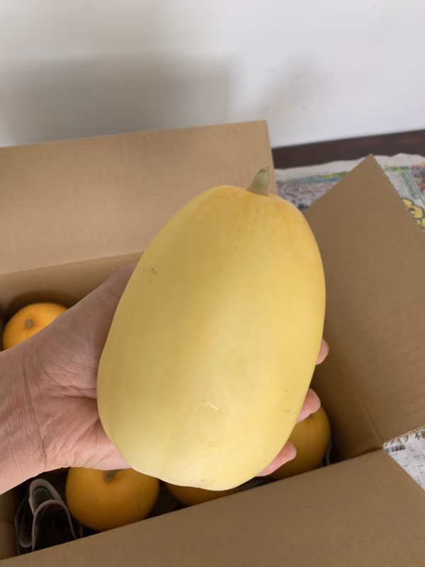 追熟が進みますとオレンジ色の果皮になり、果皮にヒビ割れが入ります。メロンのように種とわたを取り除き、梨のようにカットして食べると、素朴で爽やかな甘みがお愉しみいただけます。そのままミキサーにかければ、絶品スムージーの出来上がりです。