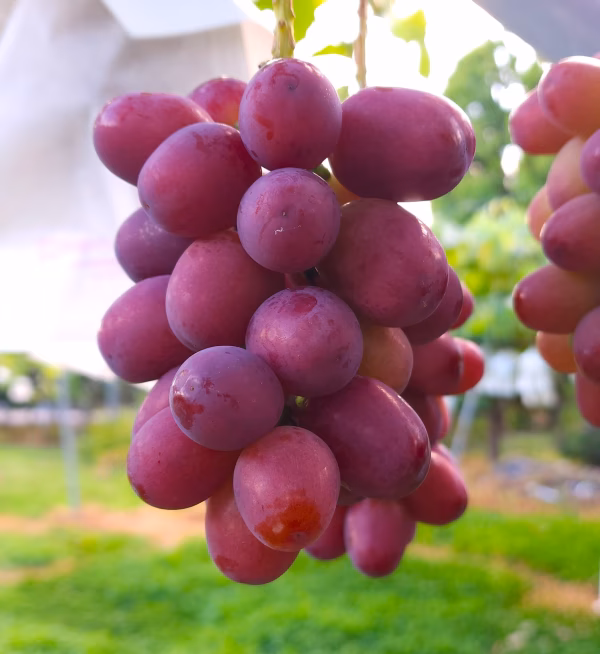 ※丁寧な梱包を心がけておりますが、配送時の揺れや傾きにより房から実が外れてしまう場合がございます。予めご了承いただきお申込み願います。クイーンルージュは、やや脱粒(房から粒が取れてしまう)しやすい品種ですので、ご了承の上ご注文をお願いします。