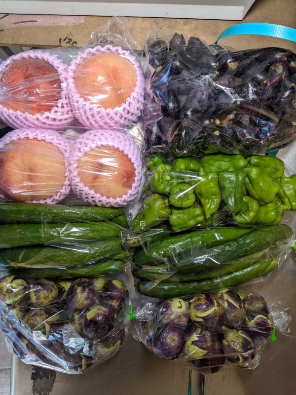 桃あかつき4個、若もぎ小なす1kg、薄皮丸ナス500g✕2袋、キュウリ650g✕2袋、ピーマン350gの詰め合わせです。