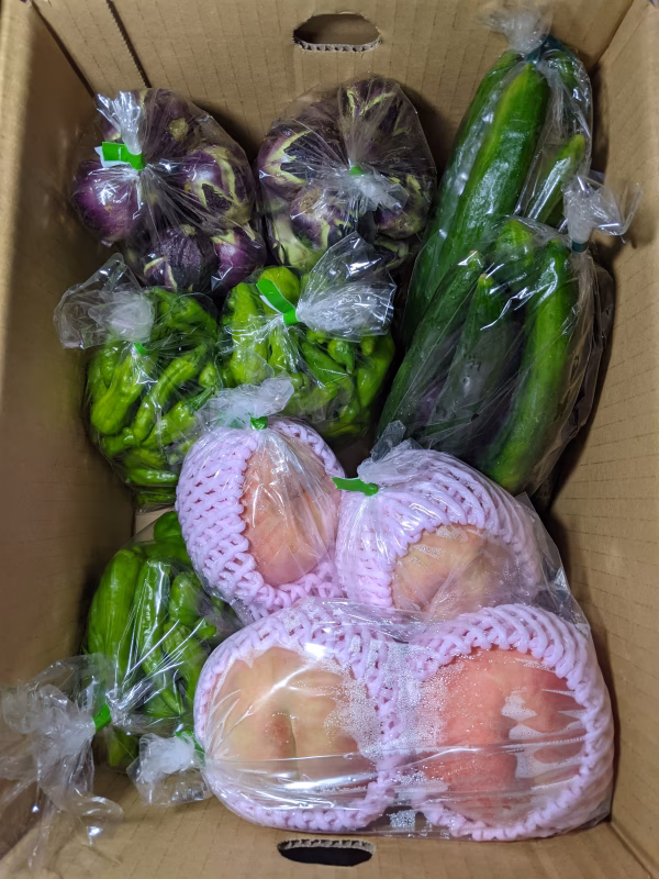 あかつき6個、薄皮丸ナス400g✕2袋、キュウリ5本入り✕2袋、シシトウ2袋、アマトウガラシ1袋の詰め合わせです。