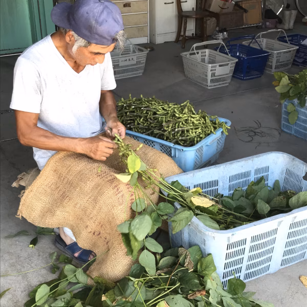 枝付き枝豆を1袋に230g入れています。これを15袋まとめて発送します。1箱は3.45kg入りです。