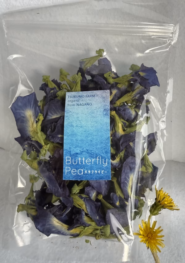 そんなバタフライピーを、乾燥機でゆっくり乾燥させ、ドライバタフライピーにしています。お湯をかけると、プルーハワイのようなキレイな青い色が出ます。味はほとんどありません。
