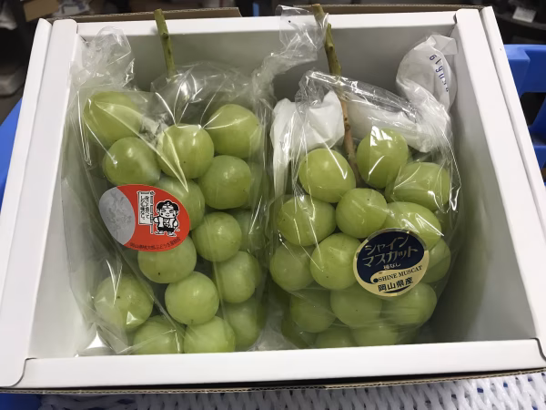 粒が小さく全体の形が悪い"訳あり"のシャインマスカットと桃太郎ぶどうの房付きを1房ずつ計2房(重量は約1kg)です。