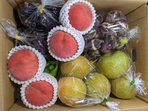 桃は、まどかで750gです。小さいサイズで硬めなので甘さは控えめです。梨は幸水で2.3kg、薄皮丸ナス1.3kg、アマトウガラシ200gの詰め合わせです。