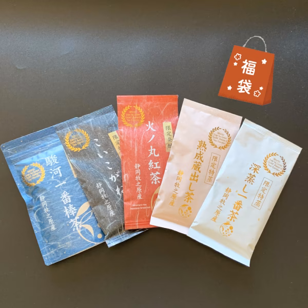 \福袋限定SET/\数量限定!特別価格!!/    \みずたま農園ファンの方必見/ 「みずたま農園のファンだからせっかくだから飲み比べを!」 「種類がたくさんあるから悩む・・」 「飲み比べで好きなお茶を見つけたい!」 そんな方におすすめです☆ ==当園オリジナル製法のお茶が5袋セット== ●\人気No1茶葉/限定特蒸 深蒸し一番茶 茶葉 100g ●\ぎゅうっと濃縮/限定特蒸 こいこがね 100g ●\丸みのある口当たり/限定特蒸 熟成蔵出し茶 茶葉 100g ●\棒茶ですっきり/限定特蒸 駿河一番棒茶 120g ●\国産茶葉使用/限定発酵 火ノ丸紅茶 茶葉 60g ーーーみずたま農園製茶場オリジナル製法ーーー 限定深蒸製法は強い味と香り、コクのある甘みとなるよう、形に囚われず滋味を追求した当園独自製法です。 普通煎茶より深く深くしっかりと蒸した茶葉は栄養が溶け出しやすく、大切なお茶の栄養素をそのまま丸ごといただけます。 静岡県産茶葉本来の豊かで心弾む香りが、お茶の中に広がります。 ーーーーーーーーーーーーーーーーーーーーーーーー ▼限定特蒸 深蒸し一番茶 茶葉 ▼ 旨味と心地よい渋みのバランスが1番取れたお茶ができると言われていて、自家用・来客様用と多岐に渡って飲まれているお茶です。 飲み口にて強い味と香りが味わえるように火入れ加減を風味が飛ぶギリギリまで強くかけ、まろやかで芳しい甘い香りが感じられるお茶に仕上げてあります。 ▼限定特蒸 こいこがね ▼ 収穫量の少ない一番茶早期に摘んだ茶の葉だけを使用し、茶の葉に凝縮された旨味と甘みを最大限引き出す独自の特蒸し製法で仕上げました。 葉緑素(緑の色素)が増える前に摘み取ることでしか味わえない旨味と甘みが楽しめるお茶です ▼限定特蒸 駿河一番棒茶 ▼ 棒茶は通常の煎茶に比べて煎はききませんが(抽出できる回数が少ない)、 お茶の旨味・甘み成分であるアミノ酸は、茶葉より茎の方が多く含まれています。 限定特蒸製法で仕上げることで、茎の芯の部分まで蒸し切り、雑味を抑えているので、独特の強い旨味と苦渋味の少ないあっさりとした後味、黄金色の水色が楽しめます。 ▼限定特蒸 熟成蔵出し茶▼ 一年を通して低温管理されたお茶専用冷蔵庫でじっくり熟成しました。 青臭みの角が取れ、柔らかく丸みのある香りと深みのある味が楽しめます。 ▼限定発酵 火ノ丸紅茶 茶葉▼ 海外で紅茶用に栽培されている品種と比べて苦みが少なく、ほんのり甘いまろやかな口当たりが特徴です。 手作業で複雑な工程を経て作られる限定発酵製法は、当店自慢のこだわり技術! 日本の緑茶が持つ優しい口当たりを最大限に生かしながら、茶葉から抽出される自然な甘さと美しい茜色を大事に加工しています。
