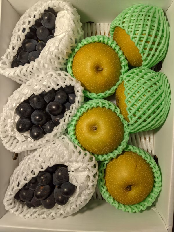 ぶどうの品種は高尾です。種無しで果肉はかためで締まりがあり、甘味が強くて酸味はおだやかです。濃厚な味わいで果汁も多く、ほのかに巨峰のような香りも感じられます。