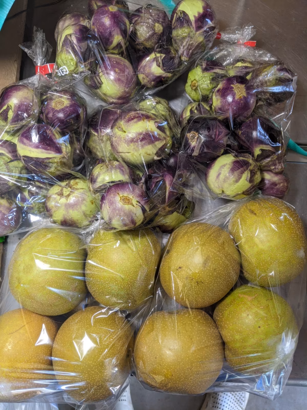 幸水8玉2.6kgと薄皮丸ナス2kgです。