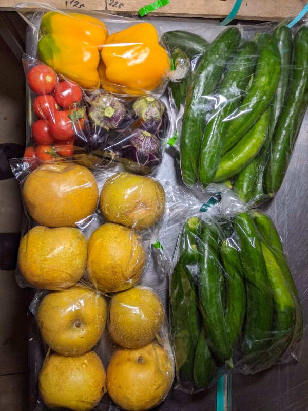 幸水8個、キュウリ2kg、パプリカ2個、ミニトマトナス1袋の詰め合わせです。