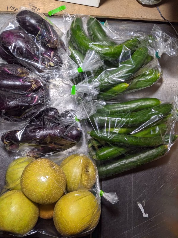 幸水1.8kg、キュウリ2kg、長ナス1kgの詰め合わせです。