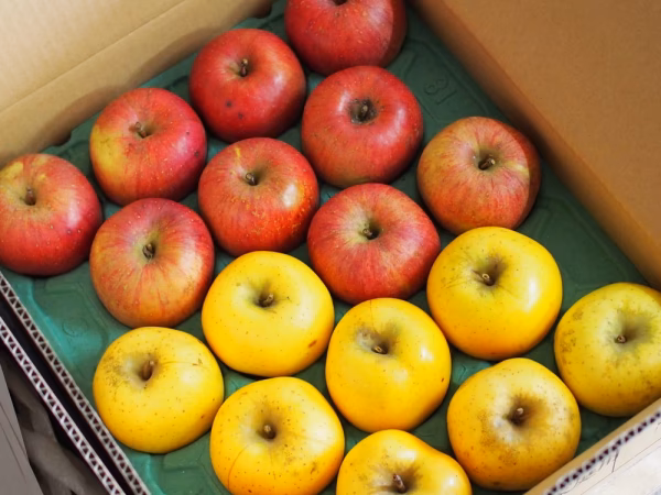 ●りんごの表面がベタベタしているのは、ワックスではなく、食べごろになった完熟の証です。りんごの皮表面にあるろう物質がりんご内の脂肪酸に溶かされて表面に出てきています。りんご内の水分の蒸発を防ぎ、新鮮さを保つ役割があります。特にシナノゴールドはこの現象が出やすい特性があります。