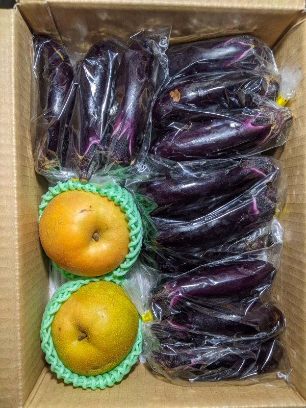 幸水2個と長ナス20本の詰め合わせです。