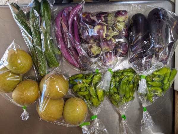 幸水6個、丸ナス1袋、長ナス1袋、紐ナス1袋、キュウリ1袋、シシトウ300gの詰め合わせです。