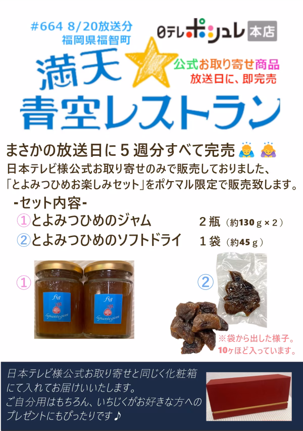 2022.08.20放送の「満天☆青空レストラン」で取り上げていただきました、当園の福岡県産"極上フルーツ"とよつみひめ100%使用したオリジナルのジャム&ソフトドライのお楽しみセットです。