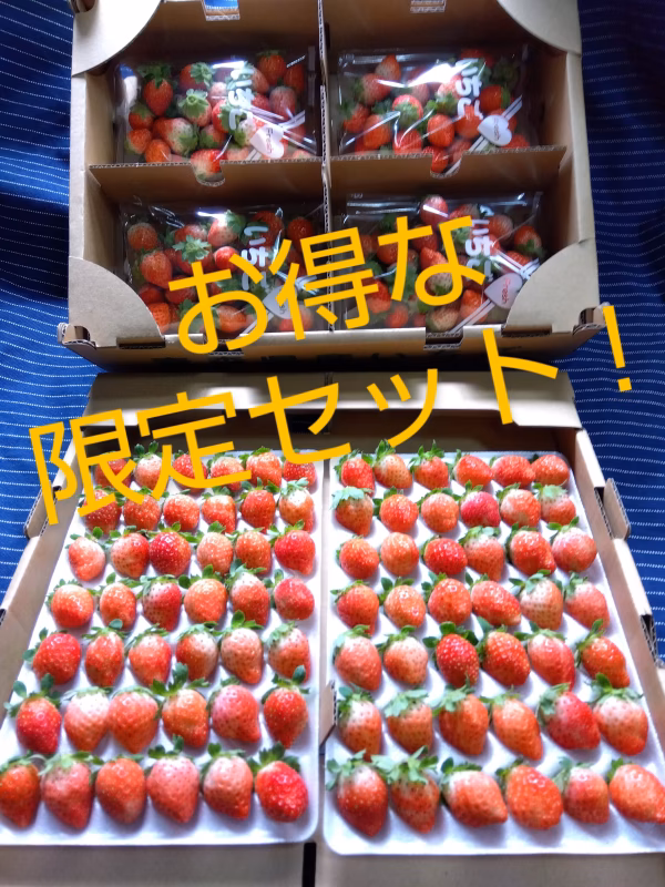 【7周年福袋】限定企画のお得パック!42玉2パックと規格外1キロ以上のセット、特別価格商品です! 42玉2パックと、規格外小玉サイズ中心のイチゴを4パック1箱まとめて発送します。 規格外小玉サイズ1パックあたり270g前後です。 規格外は写真のように、規格外の小さいイチゴ中心に、早熟や過熟、形悪いもの、先端白いもの、しわ有るもの等、規格外B品になります。 猛暑の影響で酸味もありますので、生食より、ジャムやスムージー、ソース作りなど、甘いものと一緒の加工におススメです。 購入から7日以内に、朝採れのいちごをその日のうちに発送します。 日時指定ある場合は余裕をもってご相談ください。 🍓「すずあかね」🍓 🍎青森県で夏秋いちご「すずあかね」を生産してます。🍎 一般的なイチゴが作れない夏秋どりの品種。 イチゴらしい甘酸っぱい香りも強く、この時期に出回るイチゴのなかでも味のバランスがいいです。 🍰比較的爽やかな酸味があるので、ジャムやスムージー、生クリームと合わせるような菓子の材料になどオススメです👍️ すずあかねは北海道や東北地方など各地で栽培されています。 ただ、それらのほとんどが製菓店などに向けた業務用として出荷されるので、一般のスーパーなどで見かけることはあまりありません。 是非今だけの「すずあかね」を御賞味あれ😋 ⚡️以下の注意点読んでいただきご購入ください⚡️ 💝ご購入から7日以内には発送します💝 ☀️天候や注文状況によりますが、用意でき次第順次発送します☔️ 🚚イチゴは傷みが出やすいです🚚 輸送中、果実が箱の中で転がり、多少スレ、つぶれが発生する場合あります。 ご理解いただける方のみよろしくお願いします👍️ 🕛️時間指定 ①午前中 ※地域によって指定できない場合あり。 ②14-16時 ③16-18時 ④18-20時 ⑤19-21時 特に希望無い場合、指定無し(最短)での発送になります👍️ 📷️写真は見本ですので、時期により色形や大きさが変わります。 #夏イチゴ #夏秋いちご #ケーキ用 #加工用イチゴ #ジャム #スムージー #いちご大福 #フルーツサンド #農家直送 #いちご農家 #大容量 #訳アリ #規格外 #産地直送