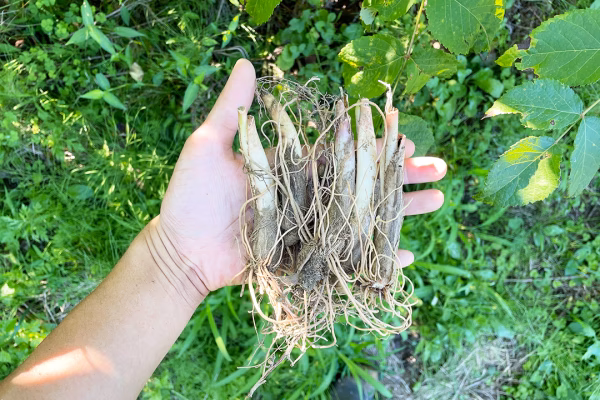 ▼商品概要 植え付けしてから7年〜8年経過した貴重な太サイズの苗根を数量限定で販売いたします。行者にんにくは植え付けから年数が経過し、苗根が太くなるようにじっくりと育てたものほど生葉の茎も太く、食べ応えがある行者にんにくになります。秋に植え付け後、翌春から収穫が楽しめます。2枚葉と3枚葉になる行者にんにくがあり、3枚葉の方は種を実らす蕾が付きますので、3枚葉の方は収穫せず、2枚葉の方を収獲ください。葉が枯れた秋以降、株分けも可能です。 ▼数量 行者にんにくの苗根 中サイズ 7年〜8年物 20本 ▼行者にんにくの苗根の状態 休眠期のため、苗根だけの状態となります。ご到着後、すぐに植えない場合は、苗根が乾燥しないように、日陰の場所などで保存ください。保存後1週間以内には定植してください。 ▼行者にんにくの苗の植え付け方法 半日陰で水はけの良い場所が適しています。行者にんにくは夏場の直射日光や乾燥に弱い植物ですので、直射日光が当たる場所は避けてください。直射日光が当たる場所の場合は、遮光ネットを貼って暑さ対策をしましょう。地植えの場合は、苗を移植をする前に、堆肥を充分に入れて耕し、1ヵ月は土を寝かせておきます。鉢植えの場合は水はけのよい土を使用し、植えこみします。いずれの場合も、できるだけ直射日光が当たらない場所で管理して下さい。肥料は年に一回、新芽が出る前の2月頃に化成肥料を与えて下さい。 ▼行者にんにくの収穫時期 行者にんにくの収穫時期は4月〜5月頃になります。葉っぱが垂れてしまう前の、柔らかい若葉の頃に収穫ください。柔らかい若葉の頃に収穫ください。植え付けの翌年の春から収穫が可能です。2枚葉と3枚葉になる行者にんにくがあり、3枚葉の方は種を実らす蕾が付きますので、3枚葉の方は収穫せず、2枚葉の方を収獲ください。 ▼幻の山菜 行者にんにく 行者にんにくは、シャキシャキした食感と、にんにくのような強い香りが特徴の山菜です。天然物と栽培物の2種類があり、一般的にスーパーなどに流通するのは栽培物になります。天然物は北海道などの涼しい気候の場所でしか育たず、天然物を見つけ出すことはなかなか困難と言われています。また、近年では乱獲の影響により、天然物が減少していることや、収穫のタイミングも一週間ほどしかないことから、幻の山菜とも呼ばれている貴重な山菜です。 ▼行者にんにくのオススメの食べ方 行者にんにくは定番の醤油漬けや行者にんにく味噌を始め、豚バラ肉と炒めたり、パスタと合わせてペペロンチーノ風など、様々なレシピにアレンジが可能です。長期保存したい方は醤油漬けや、行者にんにく味噌に加工するのがオススメです。なお、行者にんにくは鮮度が命ですので、収穫後はその日のうちに調理してください。冷蔵庫で保存する場合は、キッチンペーパーを湿らせて、根元を包んで保存すると、約1週間ほど保存が可能です。 ▼注意事項 ・苗根の詳細な大きさはご指定頂けませんのでご了承ください。 ・ネコポスでお届けのため、1個単位でのご注文になります。 ※複数ご注文の場合は、宅急便でのお届けも可能です。お気軽にメッセージください。 ・ポストに投函となります。
