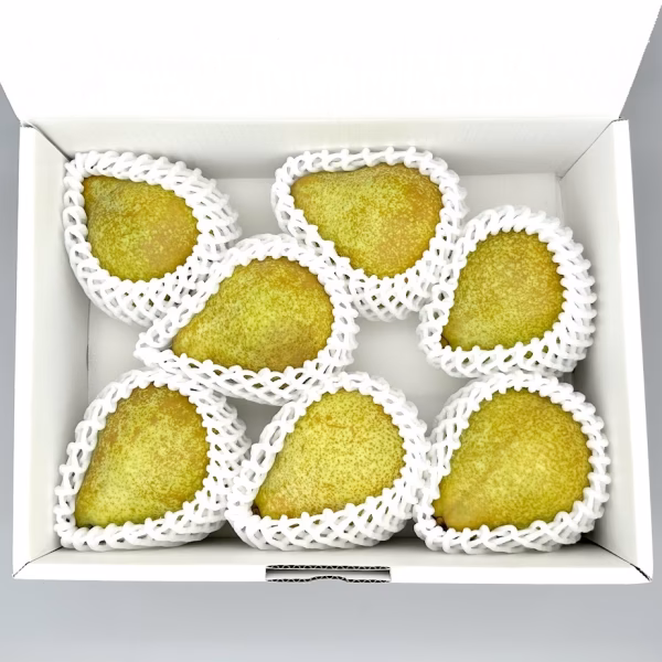 西洋梨の早生品種、オーロラ。追熟により緑色が抜け薄黄色になり、ほのかな香りがしてきたら食べ頃です。ナイフがすっと入る柔らかさ、舌の上でとろけるようななめらかな食感、高い糖度が特徴です。