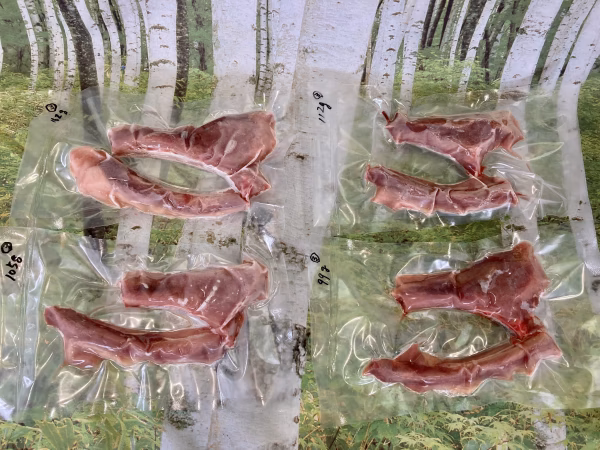 内容は、ロース、バラ肉のアバラ骨付き4本、梱包の都合で1本を2つに分割してパッキング合計478gになります。