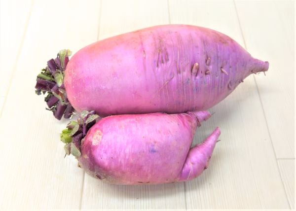 このページを閲覧されたお客様へ 皆様に、安心安全で美味しい野菜をお届けしたいと努力してきましたが、2020年~2023年パンデミックの影響もあり取引飲食店様の減少と野菜価格低下等の影響で大手農場等が市場参入し、野菜野菜によっては更に価格が暴落気味となっており、農薬を使わない野菜も同様にみられて道の駅等の産直販売店では価格を下げて販売せざる負えない状態で、商品販売価格に対し経費上昇(肥料や資材・燃料費等の高騰)や異常気象の影響もあり、農業生産現場はかなり厳しくなっています。 現状、私の農場を含めて中小農業生産者は非常に厳しい状況です。 生産野菜収入での生活および農場経営に、かなり厳しい状況が迫ってきており淘汰の時代かもと感じています。 戸島農園NSの農場では、こだわりとして良質な有機質肥料を主として使用し、農薬不使用(無農薬)で栽培しておりますので、初めてご購入のお客様やリーピート購入のお客様に美味しいと評価頂けております。 これまでにご購入いただけてないお客様にもぜひ味わって頂きたいと思います。 ご購入して頂けるお客様には、戸島農園NSも含めて中小農業生産者をご購入いただくことで、助けて頂ければ幸いです。 ※有機質肥料栽培や農薬化学肥料不使用又は化学肥料低減栽培は、気候や害虫の食害等の影響が有り、生産量の安定性に欠けると云う面があり、その分お値段が高めになります。申し訳ありませんがご理解御了承の上お買い求め頂けますと幸いです。 減ビニール資材:戸島農園NSでは農業資材や梱包資材のビニール資材等の使用を極端に減らしております。無農薬無化学肥料の栽培方法と同様、ビニールマルチを微生物分解マルチに変えて、土にかえりやすい、循環性の高い農業生産を目指してます。 各種セット品のおまとめセットご要望も承ります。 お気軽にお申し付けください。 ▼商品概要 ミニサイズのむらさき大根で、サラダやマリネもお勧めです。  種蒔き時とその後の農薬類は使用しておりません。 ▼品種・味の特徴 生食がベストです! サラダやマリネ・おろし大根がおススメです。 甘みが強く辛味少ないので美味しいです。 加熱すると、アントシアニンが水分に溶けて色落ちします。 ▼数量、分量の目安 むらさき大根 約1.0㎏から サイズにより個数はバラです。 ▼栽培/生産方法、こだわり 農薬不使用栽培 無化学肥料栽培 ▼注文に際しての注意点(配送方法や納期指定など) 発送後のリスクに関しては、責任を負うことが出来ませんのでご了承下さい。