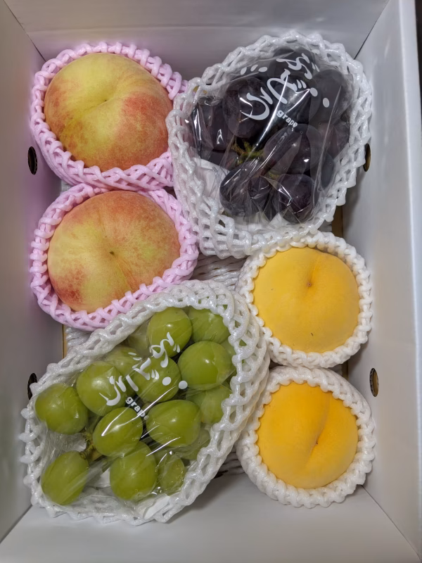 シャインマスカット1房、ピオーネ1房、川中島白桃2個、きららのきわみ小サイズ2個の詰め合わせです。