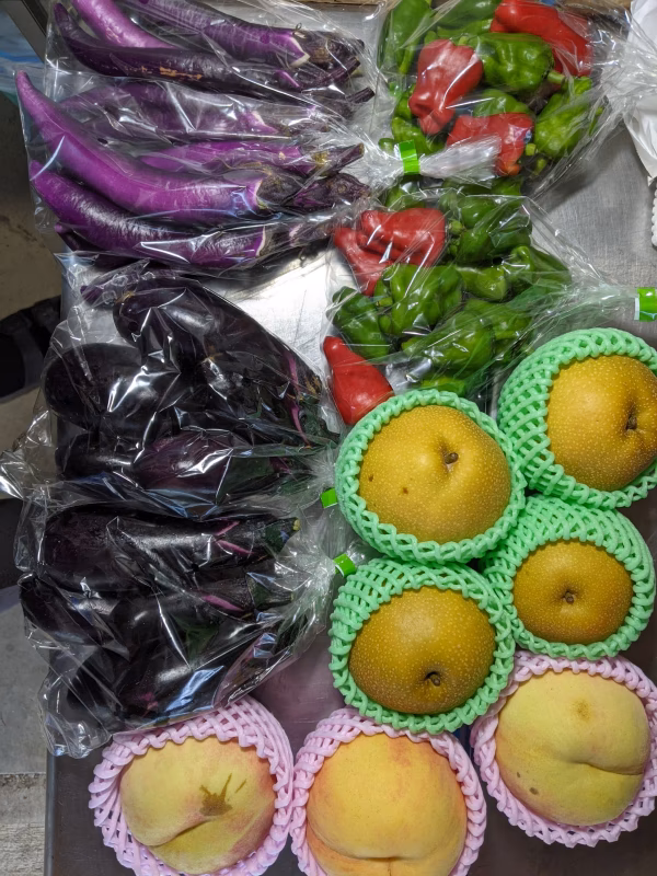 川中島白桃3個、豊水4個、長ナス2袋、紐ナス2袋、ピーマン2袋の詰め合わせです。