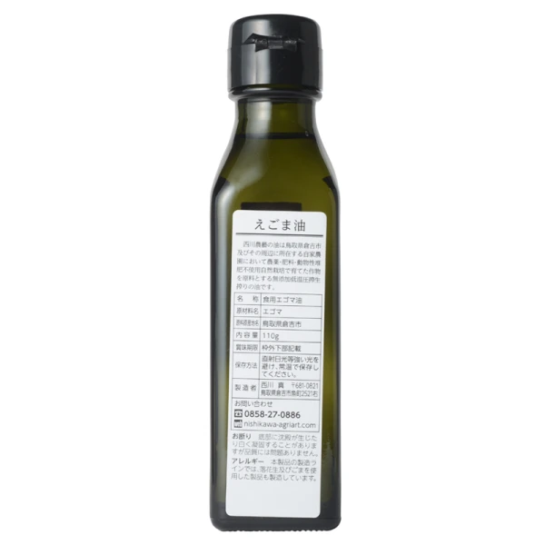 鳥取県倉吉市市内に所在する豊かな黒ぼく土壌の自家農園で自然の循環と作物の持つ生命力を引出すため農薬・肥料・動物性堆肥を使用しない自然栽培で丹精込めて育てたえごまを伝統の玉締めと同じ原理の直圧式搾油機を使用して低温で丁寧に圧搾した非加熱・無精製・無添加・無着色・無調整の完全生搾りえごま油です。