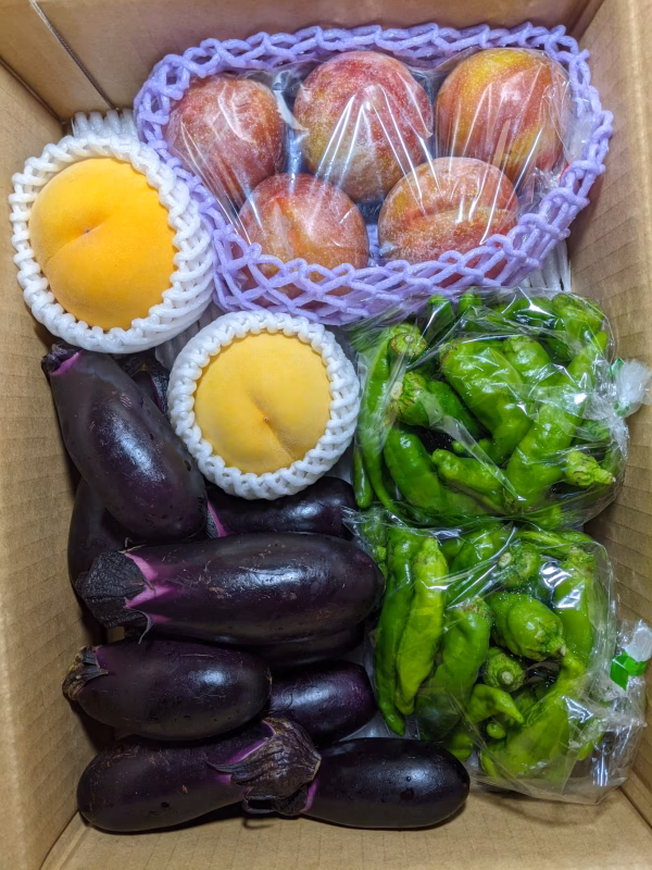 きららのきわみ2個、秋姫2個、アマトウガラシ2袋、長ナスの詰め合わせです。