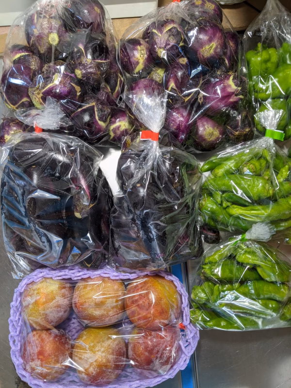 秋姫6個、丸ナス大きめサイズ2kg、長ナス2袋、ピーマン2袋、アマトウガラシ2袋の詰め合わせです。
