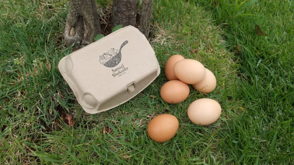 おやつにはSanagi Shokudoで育てた野菜(農薬不使用)をもりもり食べています。そんな彼らの卵の味は、臭みがなくさっぱりとしているのが特徴です。