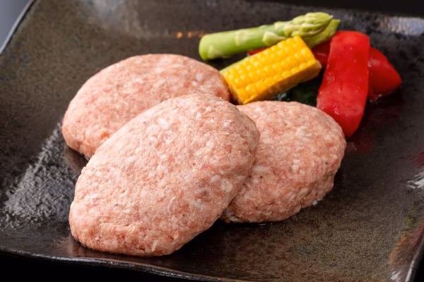 自社牧場で長期肥育した黒毛和牛(経産牛)と佐賀県産豚、白石産たまねぎなど地元のものにこだわり作ったハンバーグ。