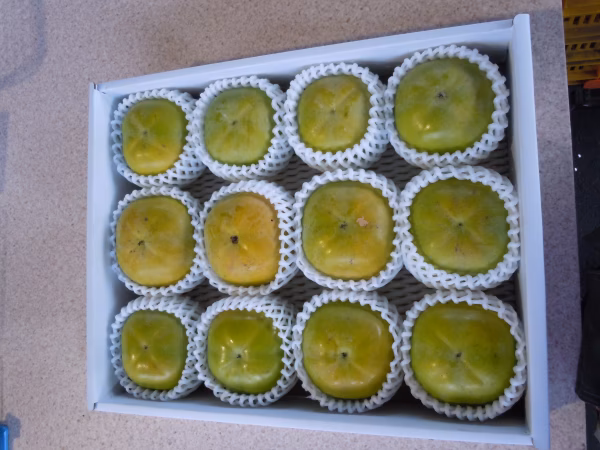 太秋は完熟果の状態が青く、サクサクした歯ごたえです。富有柿のような甘さではなく、さっぱりしたみずみずしい甘味です。条紋と呼ばれる黒い線が生じやすく、この線があることが糖度の高い証です。従来の柿とは違い、この太秋柿を求めてこられるお客様が多いです。