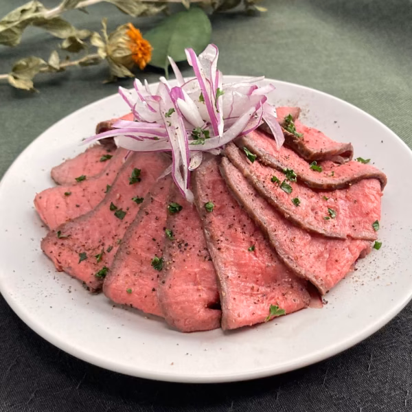 阿蘇赤身和牛の良さを最大限に引き出せる食べ方の一つは間違いなくローストビーフだと断言できます。良い牧草を食べて育った滋味深い赤身の美味しさを存分に味わってみてください。ローストビーフに最適な部位であるモモ部位を厳選しています。