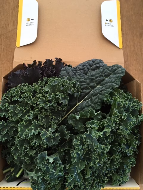 カーリーノケール、ハルブホーヘルケール、スカーレットケール、カーボロネロ、ジューシーグリーン等季節と生育に合わせて毎回1-3種類のケールを詰めてお送りします。
