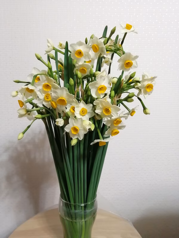 水仙を飾るお部屋の温度などによりますが、約2〜3週間程度の長い期間、水仙の香りと花が楽しめます。