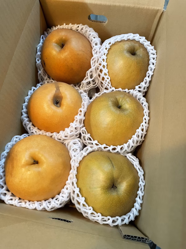 できるだけ玉数を多く入れるために、梨を包む緩衝材は薄いものに変更したり、使用しない場合があります。