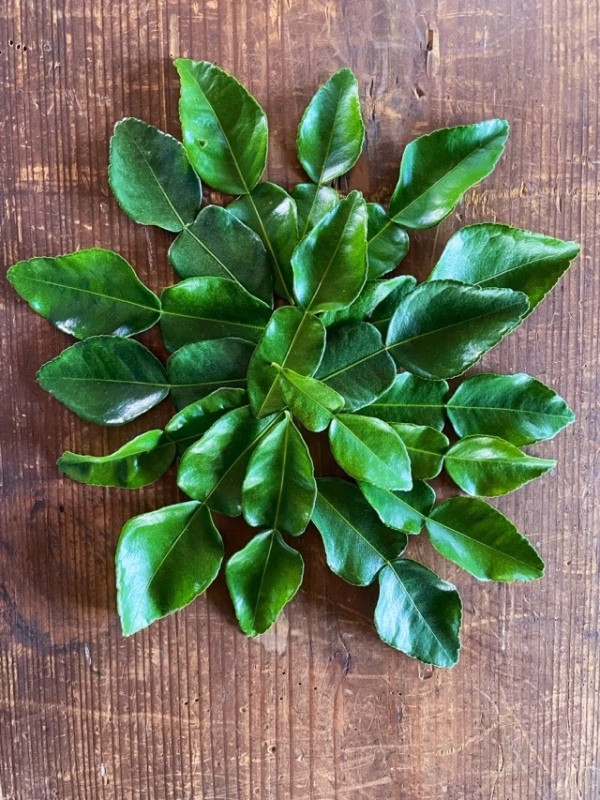香り豊かなコブミカンの葉。バイマックル、カフィアライムリーフとも呼ばれます。トムヤムクンやグリーンカレーに欠かせない香り。エスニックな香りが色んな料理を美味しくしてくれます。冷凍、乾燥も可能ですが、生葉が一番香ります。