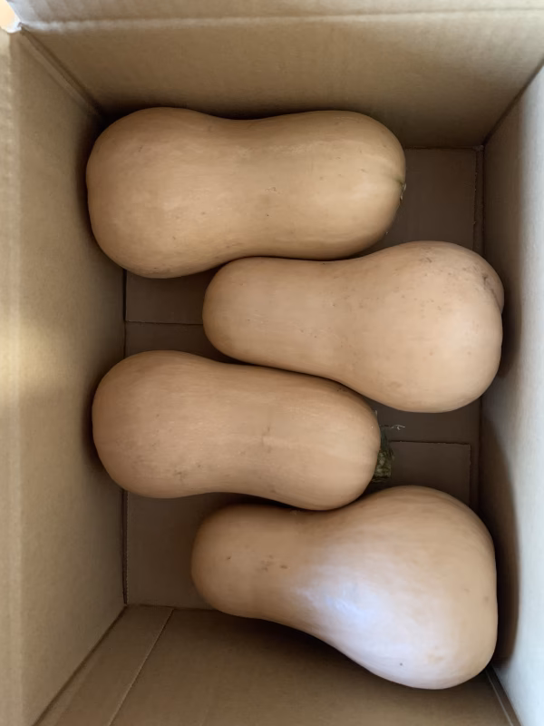 牛乳だけでも濃厚なポタージュが味わえると評判の バターナッツカボチャです。 見た目は瓢箪みたいですがカボチャです。 細長い部分と丸い部分では味が異なり、 丸い部分は濃厚で、細長い部分はややあっさりめ。 スープには丸い部分、天ぷらなどには細長い部分がおすすめだそうです。 また、皮が薄いので普通のカボチャよりもカットしやすいのも特徴です。 収穫後、1ヶ月ほど経ちましたので、追熟させる必要ありません。 いつでもお召し上がれます。 汚れや傷など多少あります。 1本あたり約500g〜約1kgで サイズはバラバラの箱ずめになります。 60サイズは(2kg以内)の発送なので トータル約1.5kg、 80サイズは(5kg以内)の発送なので トータルで約4kg、 が入ってます。 その他ご希望の分量があればリクエストしてください。