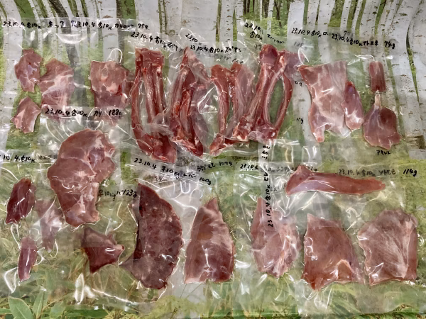 ▼自己紹介 こんにちは、自ら捕獲したイノシシの肉を販売しているジビエラッコエンの古市です。 ▼商品概要 今回は、今年10月4日に捕獲した子イノシシオス10kgです。 その半身1671gを各部位に分けてパッキングしました。 お友達グループやご家族ご親戚などでのBBQや共同購入などでご利用ください。 パッキング部位ごとの重さは、 写真①は首や肩、前足部分375g カタ 188g カタロース  75g ネック 71g マエスネ 41g ②は胴体部分733g スペアリブ(骨付きロース・バラ)13本165g 138g 101g 97g 計501g ハツ(心臓)23g レバー 100g ロース・バラ 74g ヒレ 35g ③は主に後ろ足部分563g ランプモモ 107g シンタマモモ 131g ウチモモ 137g ソトモモ 114g アトスネ 74g です。 ▼品種・味の特徴・食べ方 品種特徴:子イノシシオスの10kgということで、肉質は柔らかく、子イノシシのためジビエ独特の野獣臭はほとんどありません。 大勢でのBBQや、ジビエ料理におススメです。 調理は、前日に冷蔵庫に入れ様子を見て常温で半解凍、包丁が通るようになったところで料理内容に合わせてスライスまた角切りなど必要な大きさにカット。 スペアリブはそのまま解凍して骨付きでご使用ください。 また、ブロック肉のまま石窯やオーブンなどで焼いてからススライス小分けしてもいいと思います。 全体的に柔らかいのでBBQは厚切りでもOKです。 親猪に比べ味はちょっとタンパクですので味付けは少し濃くした方がいいかもしれません。 BBQは塩コショウ、鉄板ならニンニクなど添えて焼き、そのままか、シンプルに味ぽんなどで食べても独特の味が楽しめて美味しいです。 いろんな食べ方、味付けでわいわい楽しくBBQを楽しんでいただけたら嬉しいです♪ 注意:開封前の冷凍保存期間は1年間(2024/10/4)、開封後はお早めにお食べください。 また調理については豚肉と同じく必ず加熱してお召し上がりください。 加熱の基準は、肉の内部温度が75度で1分間、または65度で15分となっています。 焼きすぎると固くなります、また低温で焼くほど美味しさが引き立ちますので最初は2、3回温度計で計って焼き加減を感じ取っていただくといいです。 ▼栽培/生産方法、こだわり 捕獲から解体時間を短時間で、冷蔵庫での血抜きをしっかりやるなど、臭みのない柔らかい肉作りを目指しています。 ▼注文に際しての注意点(配送方法や納期指定など) 発送はポケマル提携便にて香川県から60サイズの冷凍宅急便にて出荷となります。