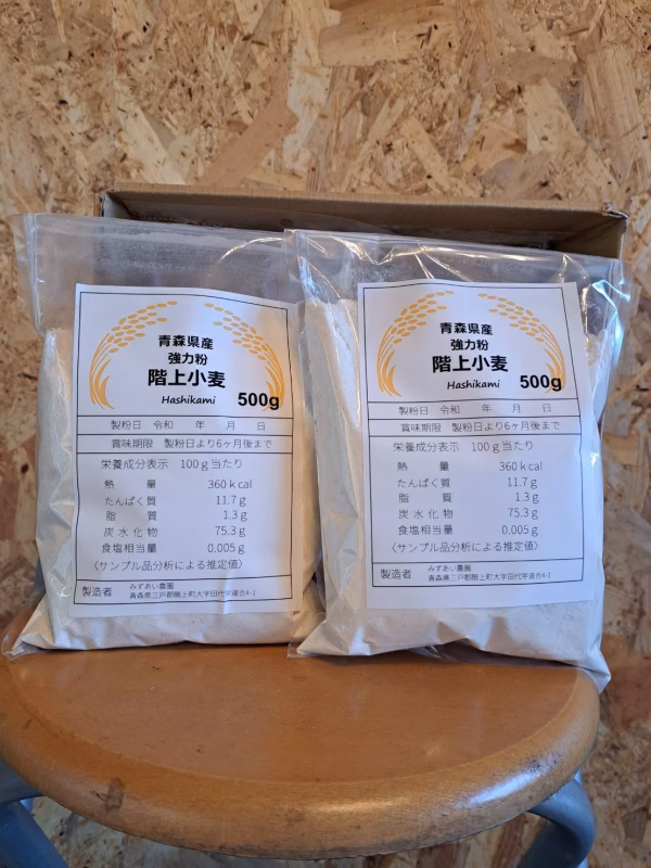 - 名称 青森県産小麦粉 原材料 青森県階上産小麦 内容量 全面ラベルに記載 保存方法 直射日光の当たらない所で保管 賞味期限 製粉日より6ヶ月後 製造者 みずあい農園