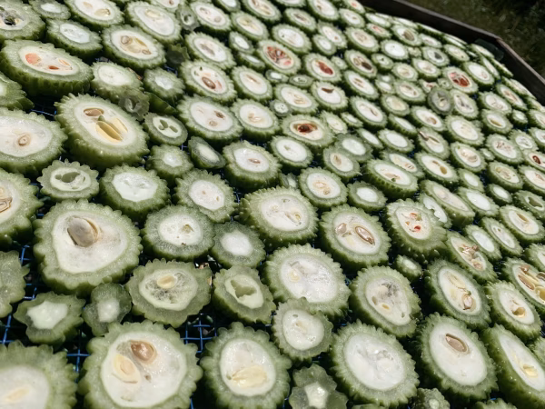 市販のチャック付き袋に入れる簡易包装です。干しゴーヤーの突起で袋に小さな穴が開くこともございます。