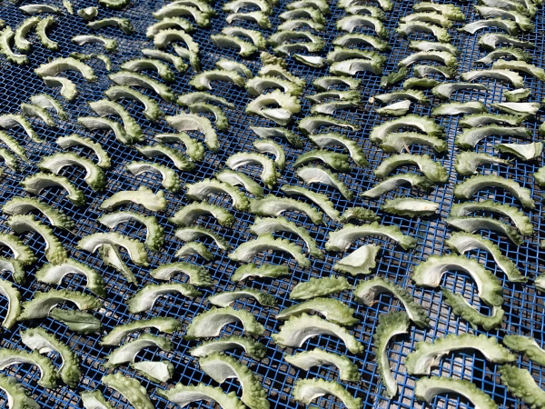 栽培期間中、農薬・化学肥料不使用で育てたゴーヤーの種とワタを取り除き、刻み、網に広げて天日で干しました。