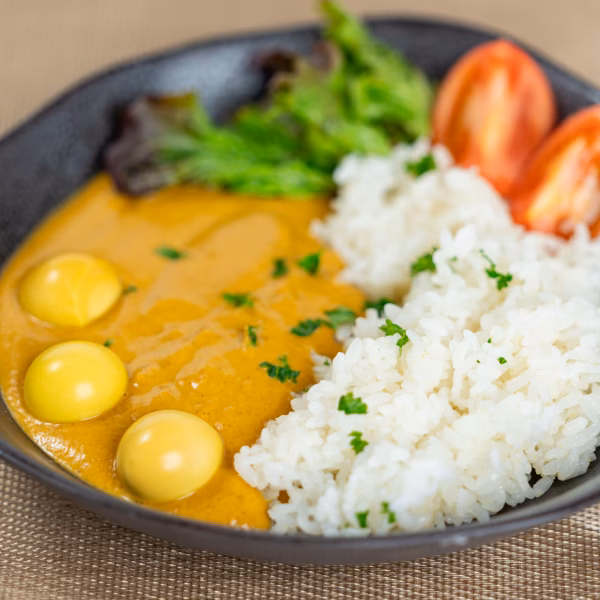 ハリヨの柿酢の製造過程で取り出される柿酢もろみ粕を食べて育ったうずらのスープがベースです。神戸で有名な神戸スパイスを使い、アクセントに柿酢もろみのフルーティーな香りのカレーに仕上げました。日本の素晴らしい自然と文化で作られた柿酢と、異国のスパイスが交わったマサラカレーです。うずらの肉をダシとして使用して栄養豊富な柿酢もろみも調味料として加えた本格濃厚クリームカレーです。