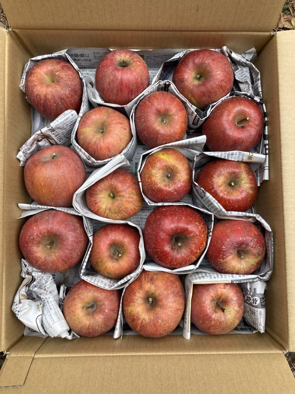 写真のように梱包いたします。(写真のりんごはサンフジです)
